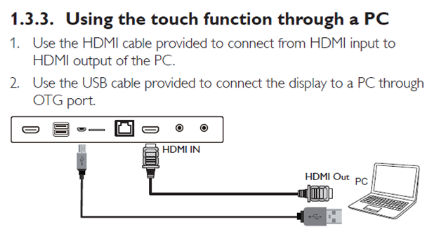 Use an HDMI cable to connect from the HDMI Output on the PC to the HDMI Input on the screen. Use the USB cable provided with the screen to connect from the USB port on the PC to the USB-B port on the screen (bottom-most port on the side connectivity ...