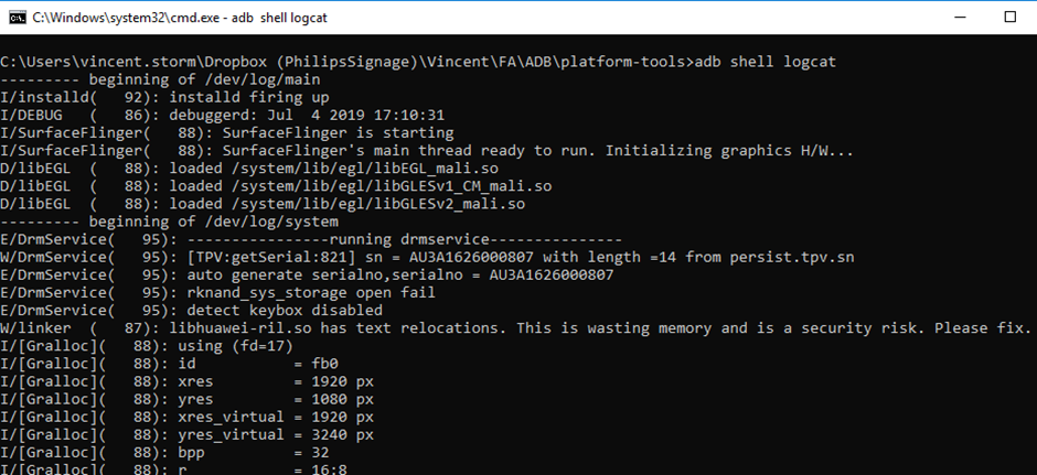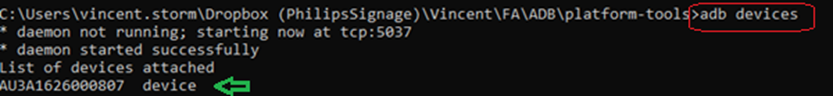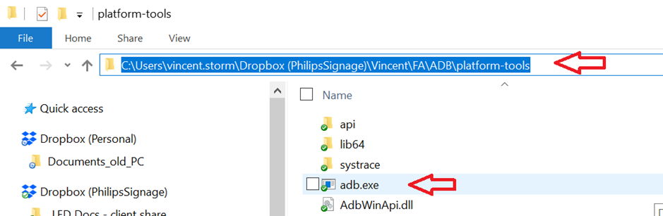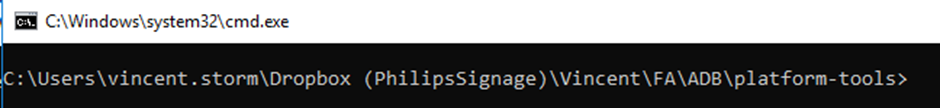 See below example, files are copied to “C:\Users\vincent.storm\Dropbox (PhilipsSignage)\Vincent\FA\ADB\platform-tools”