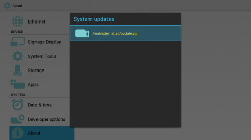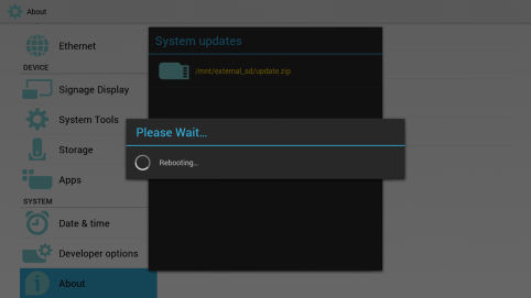 Download the latest android firmware: https://westanonline.sharepoint.com/:f:/s/Support/EvS1dktRMhFYoqHu2f1-mR0BtEW8QGJdarmflQsM49T0TQ?e=7ni8hN In the root directory of a USB disk place the update.zip files. Check if the screen is already running the ...