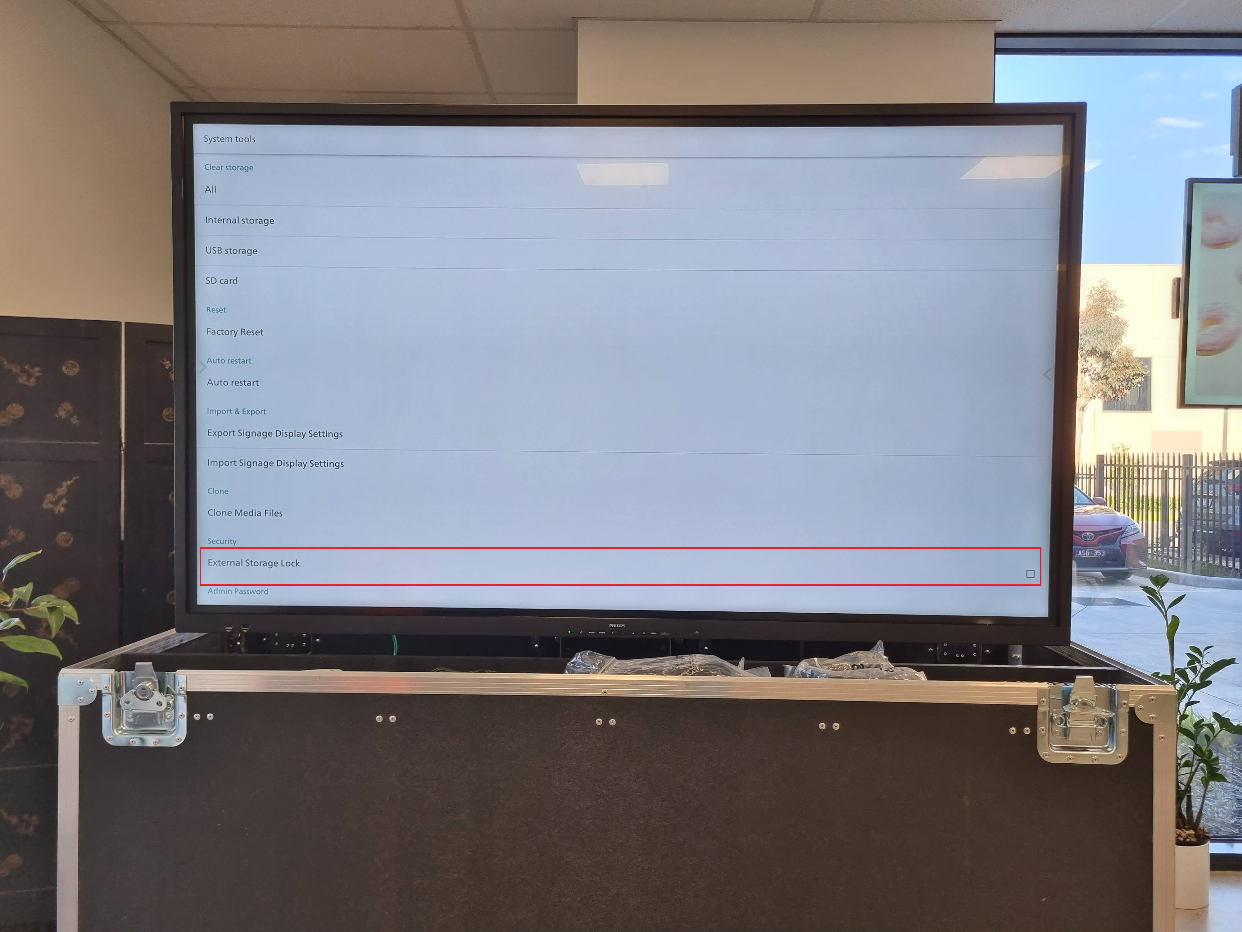 The screen "External Storage Lock" which when enabled doesn't allow new USB Drive to be recognized by the system.