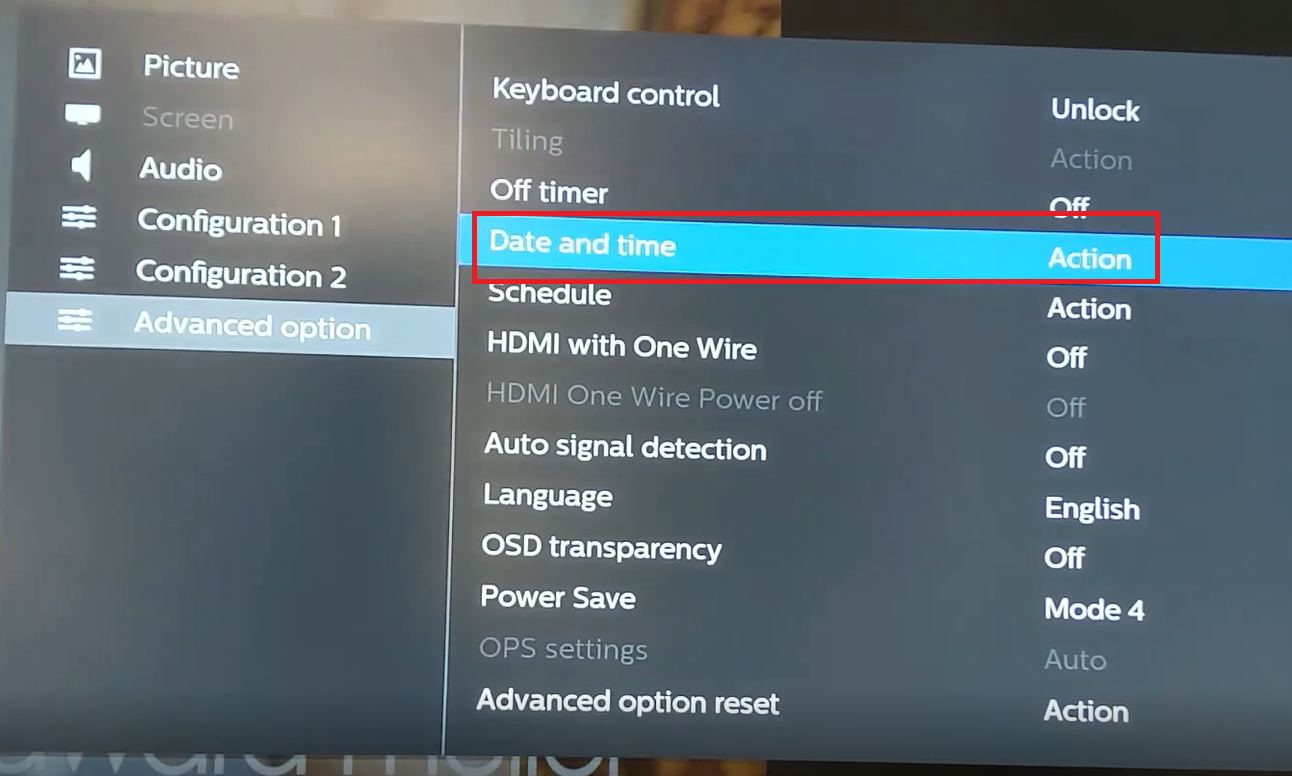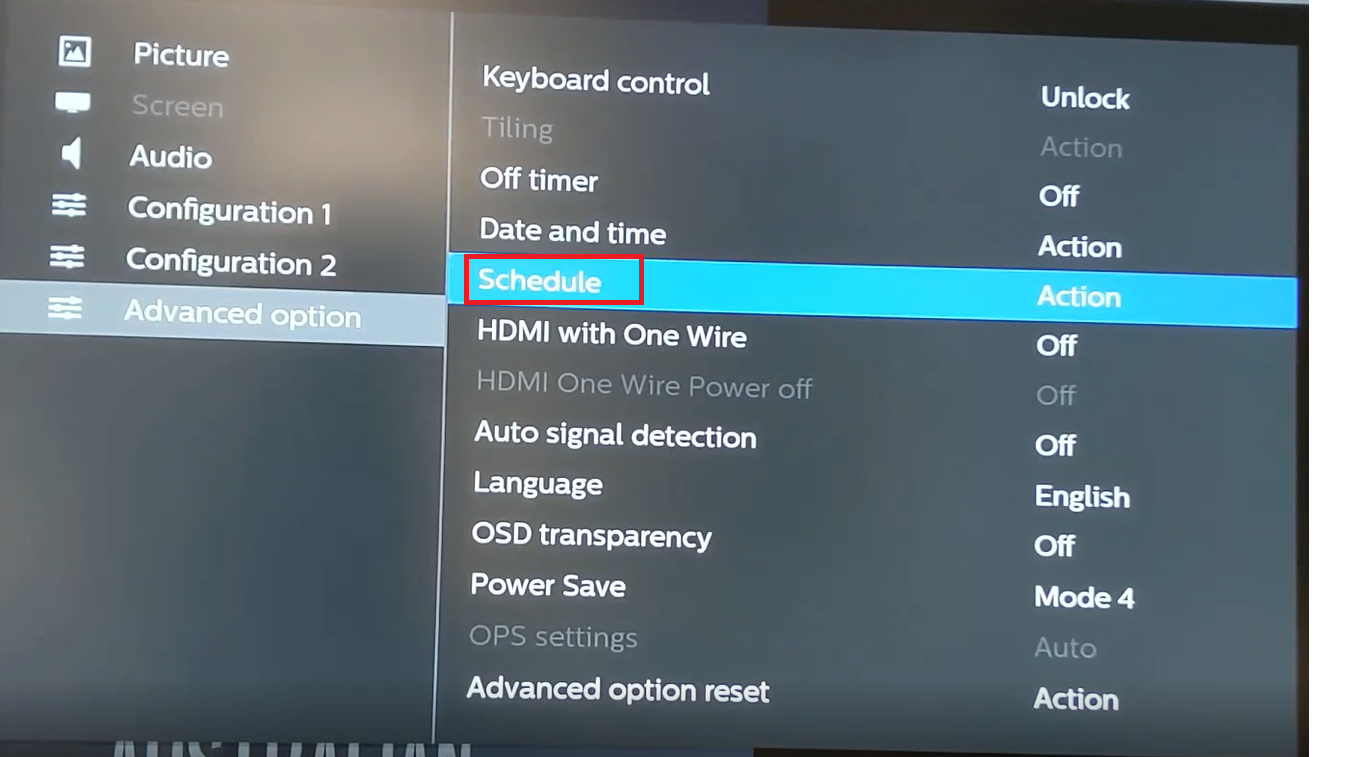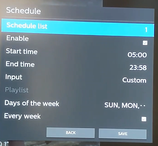 The screen has been set with schedule to turn on from 7.30am to 5pm Mon-Friday.