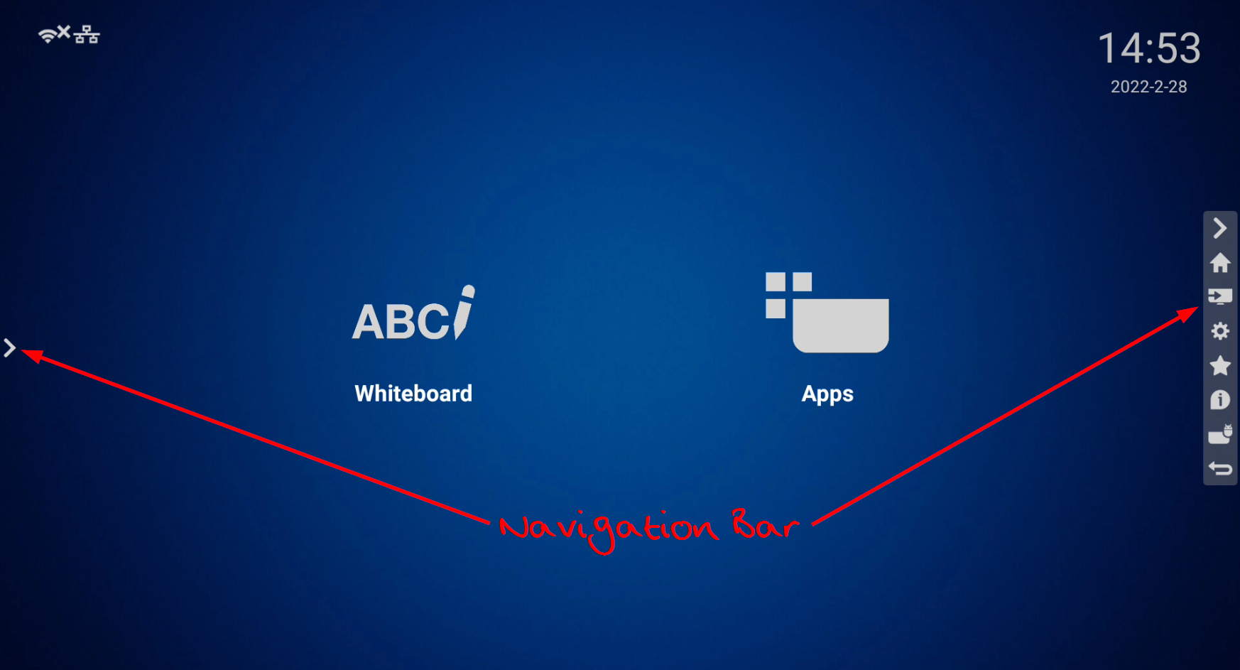 The Navigation bar appears on both left and right sides of the screen and is how you quickly switch between different parts of the system such as Home, Input sources, Screen menu, System Information, Running apps, etc.