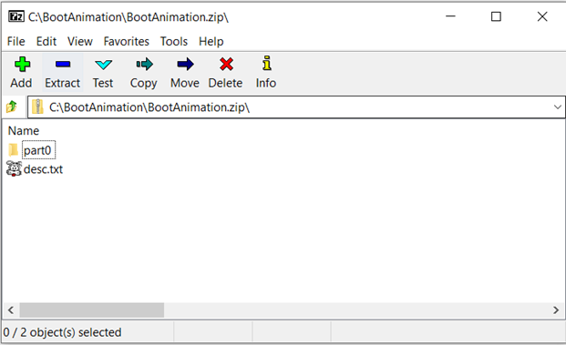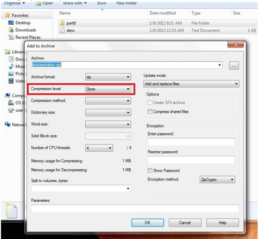Select everything (image folders and desc.txt) inside the bootanimation folder and zip them into a new uncompressed zip archive using your favorite compression utility like 7zip or WinRAR and so on.