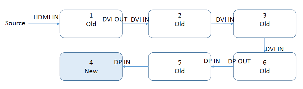 Set the new, replaced display in the last position of the daisy chain, or change the daisy chain to DP after the replaced display, see the picture below.