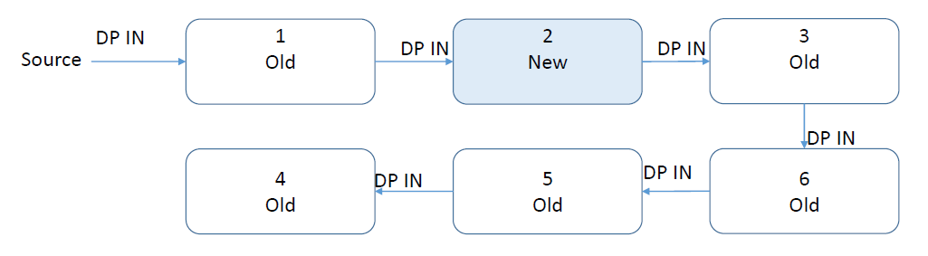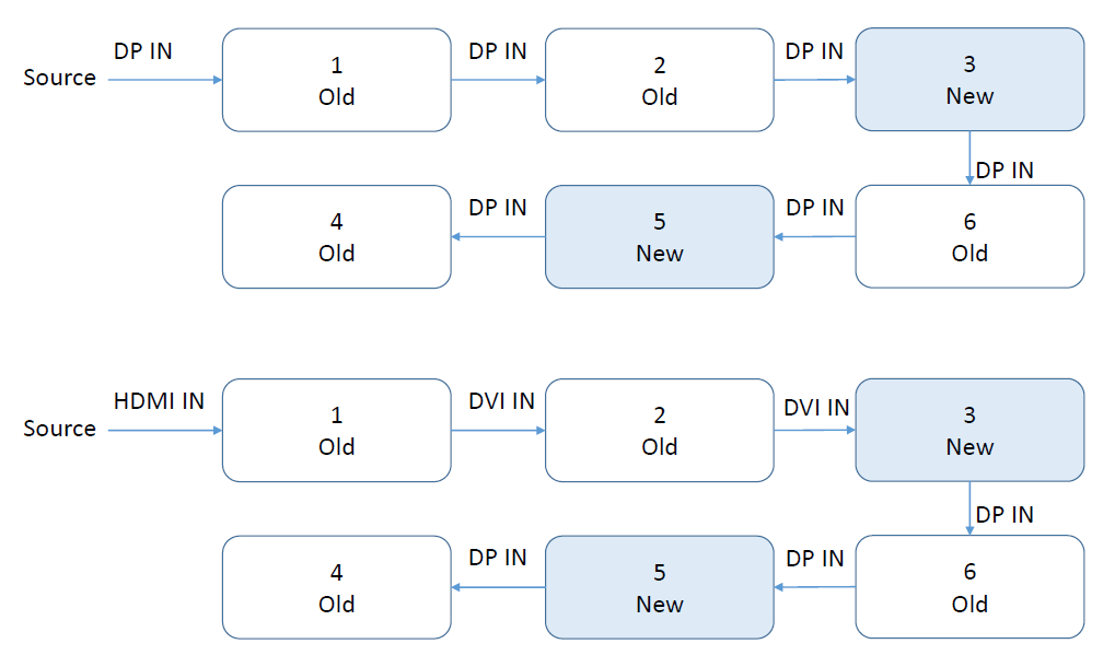 If your input signal is DP, then you can connect the older model's DP-Out to the newer model's DP-In