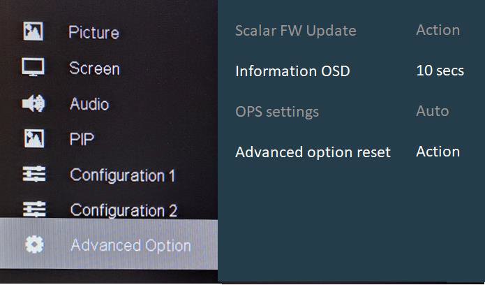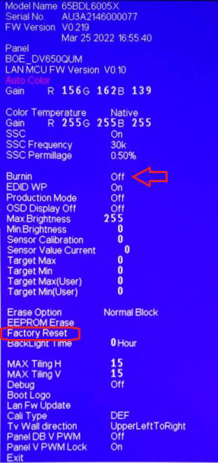 Select “Factory Reset” and press OK on the remote control, this will perform a factory reset. Once finished AC reboot the monitor.