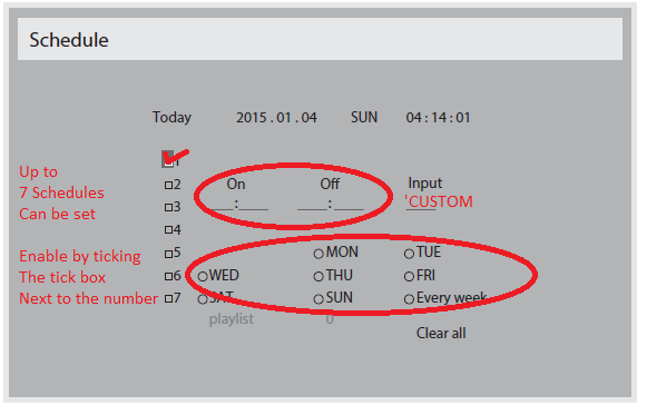 To enable the configured schedule, you must TICK the tick box on the left of the number 1-7 depending on which schedule you want to enable