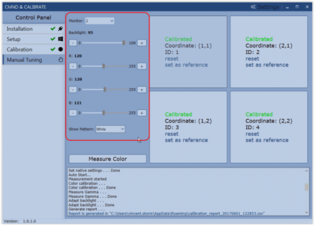 It is possible to adjust the backlight and RGB values of each screen manually by selecting “Manual Tuning” in the CMND & Calibrate menu: