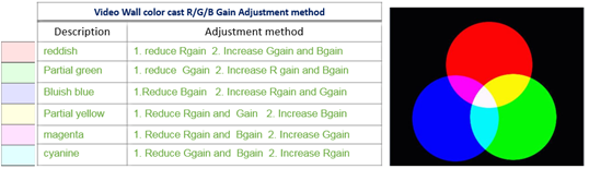 Make adjustments to the RGB gain or backlight level as needed. You can use the following image as a guide on what values to adjust depending on the tint shown on the screen: