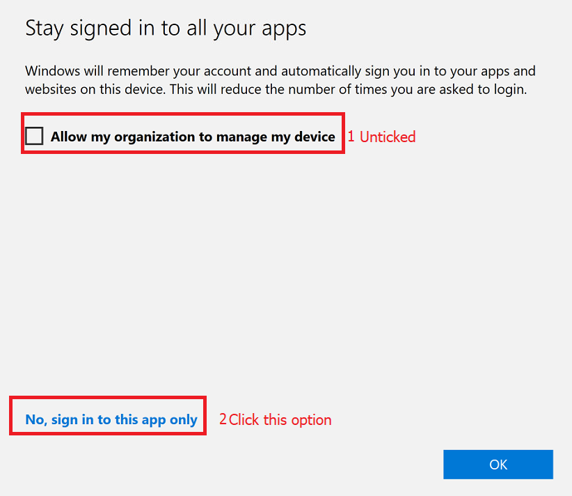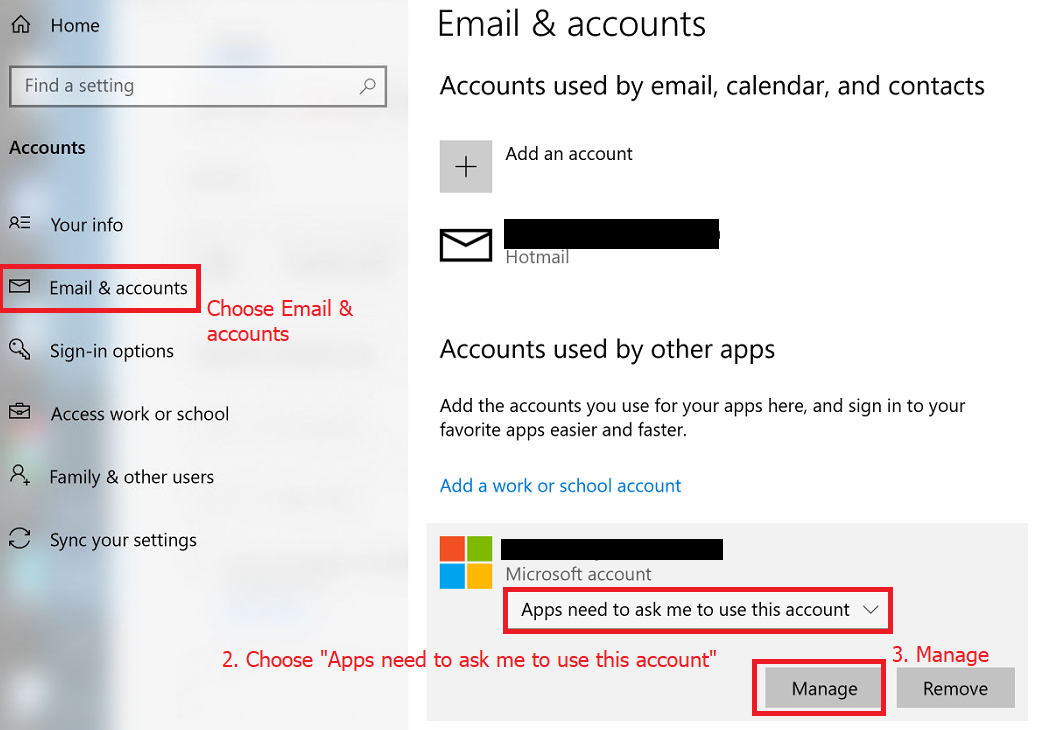 Set Email & Accounts settings to "Apps need to ask me to use this account" (you can only do this if the account used to login is Local Account - Administrator)