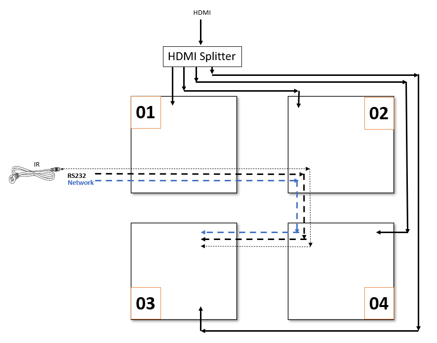 • If the IR Sensor of the 1st screen in the daisy chain is obscured by the setup, please ensure that the IR Sensor Cable is connected to it and positioned in an easy to access location.