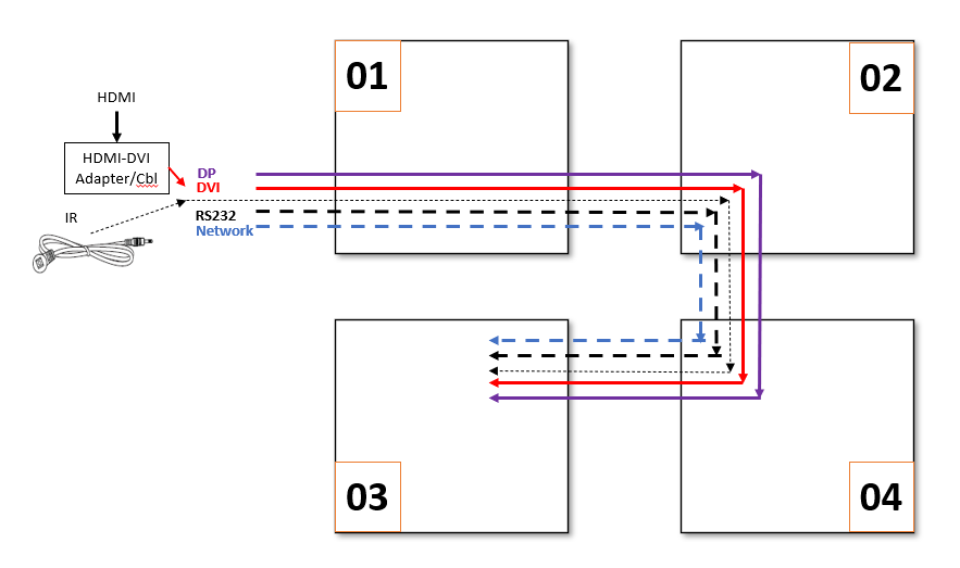 • It is recommended to daisy chain all the cables: RS232, IR, DVI & DP (DisplayPort)