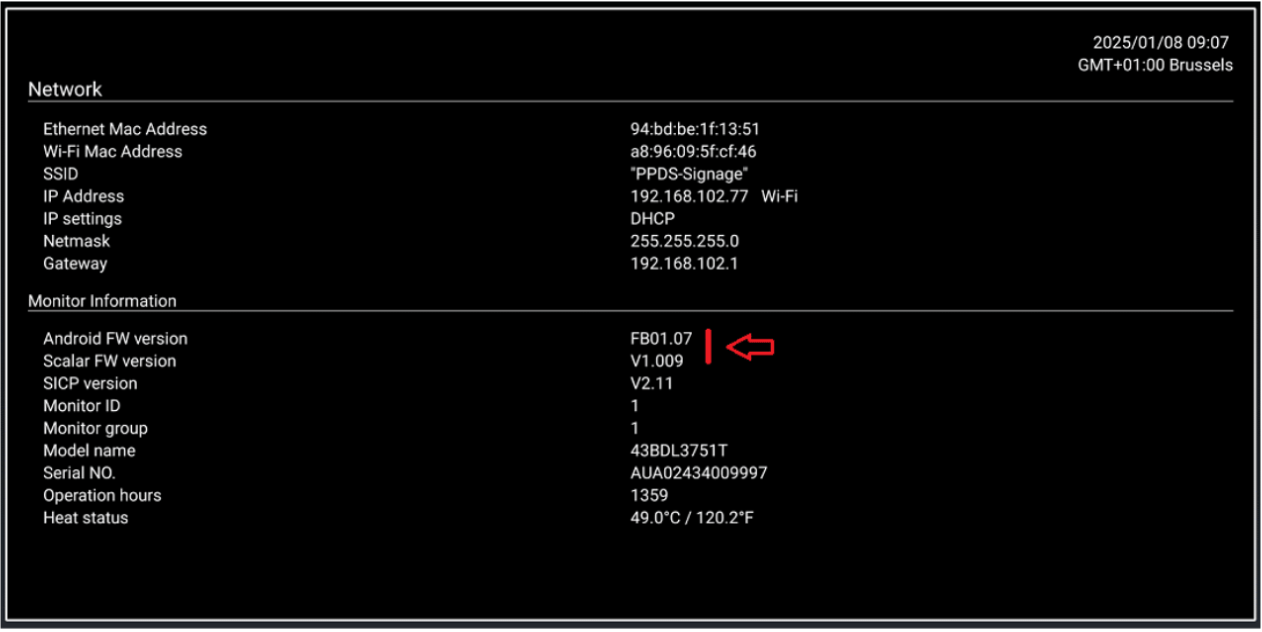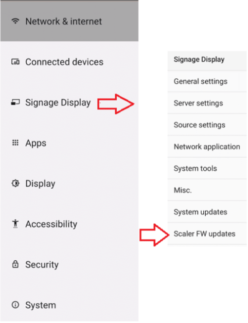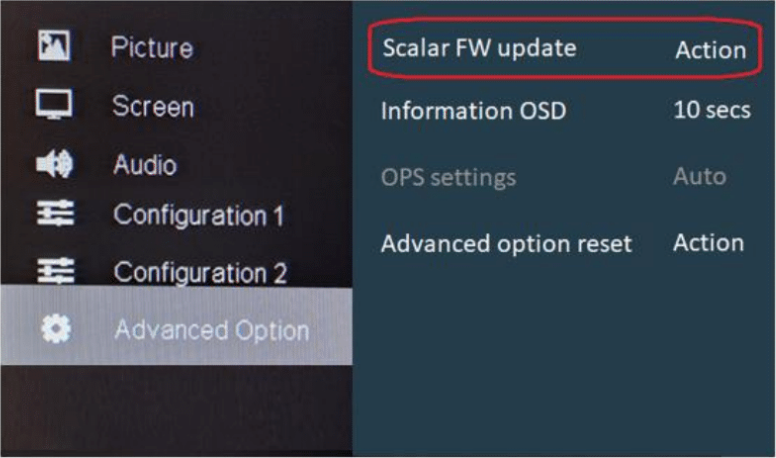 If still not working, the scalar can also be flashed from the android settings "Signage Display" --> "Scalar FW updates"