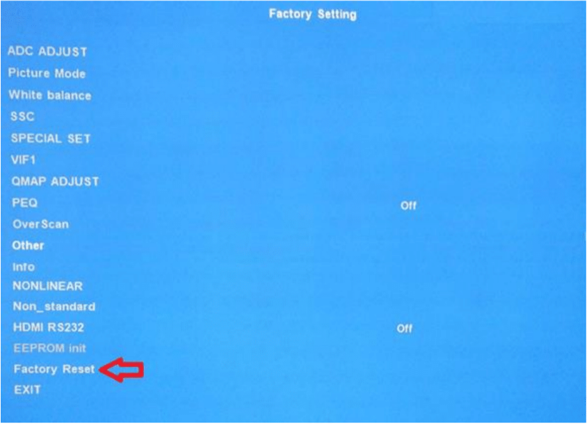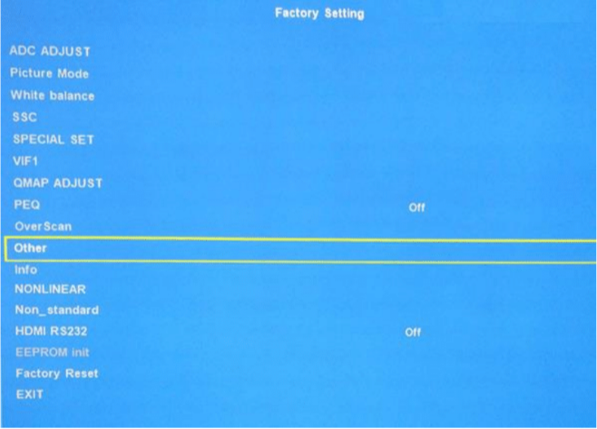 If both firmware are correct, do a factory reset from the factory menu (See red marker below), select factory reset and press OK on the remote control, you will not see any confirmation on the screen, the monitor will reboot in about 20 seconds.