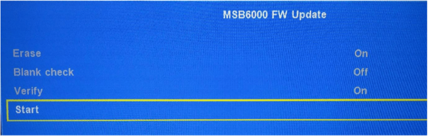 When finished enter the factory menu by pressing "Home 1999 back" on the remote control. Wait until the menu is present before pressing the "1999 back" buttons. A blue screen will appear.