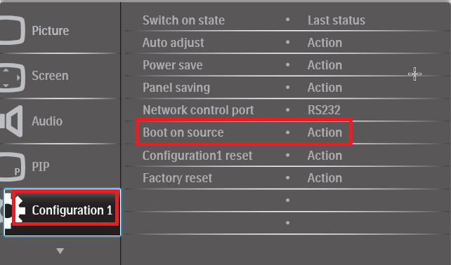Configuration 1 -> Boot on source = set it to your desired source (eg. HDMI/DVI, etc)