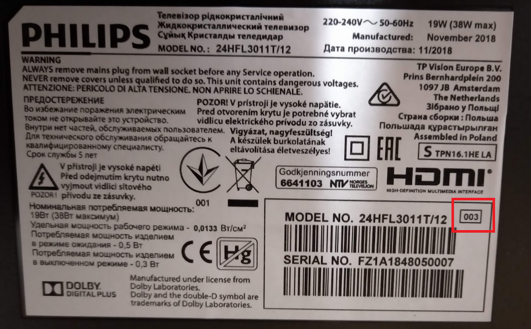 6. Enter the serial number to be found on the white sticker on the back of the TV